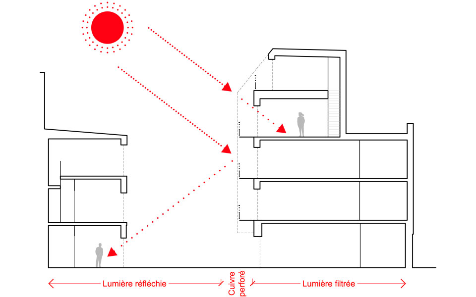 Un bardage en cuivre perforé devant les loggias permet de protéger d'une trop forte exposition les logements orientés Sud et de ramener de la luminosité pour les logements au Nord | projet MK/168-CR