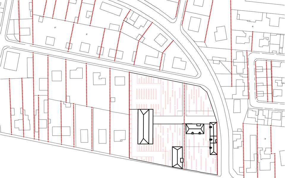 Intégration du parking et des cheminement dans une trame rappelant l'urbanisme local | projet MK/40-GS