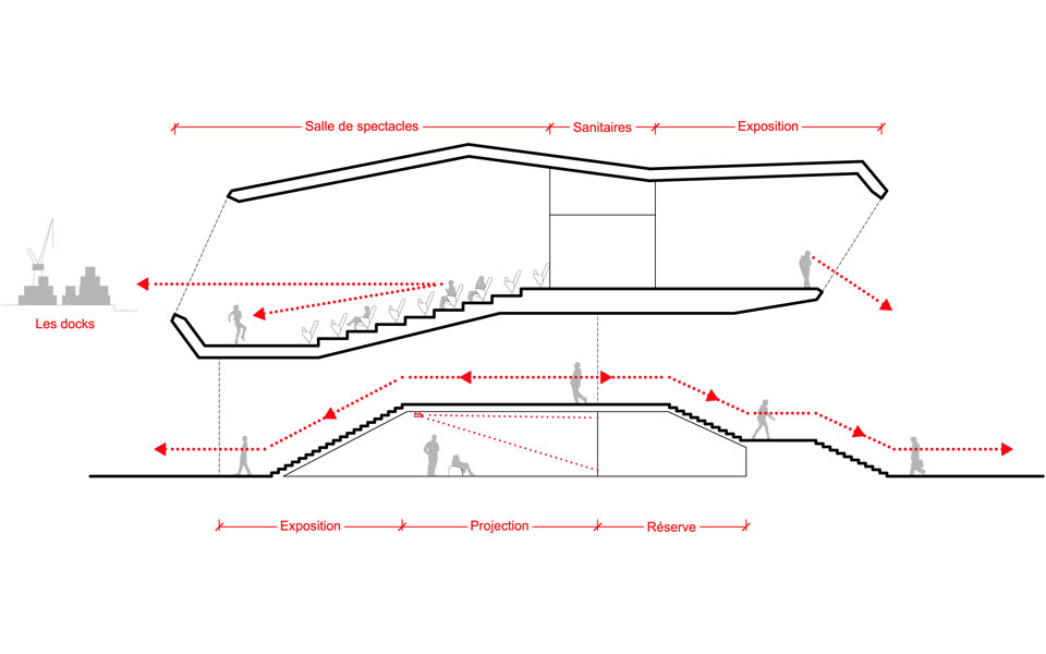Une galerie d'exposition en continuité de la rue est abritée par la salle de spectacles au dessus | projet MK/76-HC