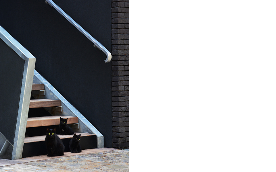 Enduit noir, acier galvanisé, pavés granit, bois d'ipé |