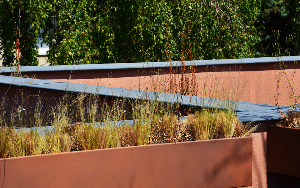 Enduit ocre, jardinières sur-mesure en acier corten, couvertines zinc |