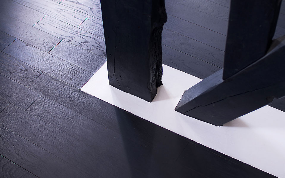 Structure existante dans un rectangle blanc en peinture de sol au milieu du parquet teinté |