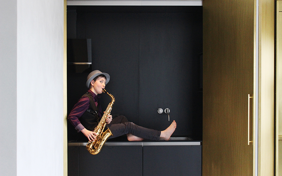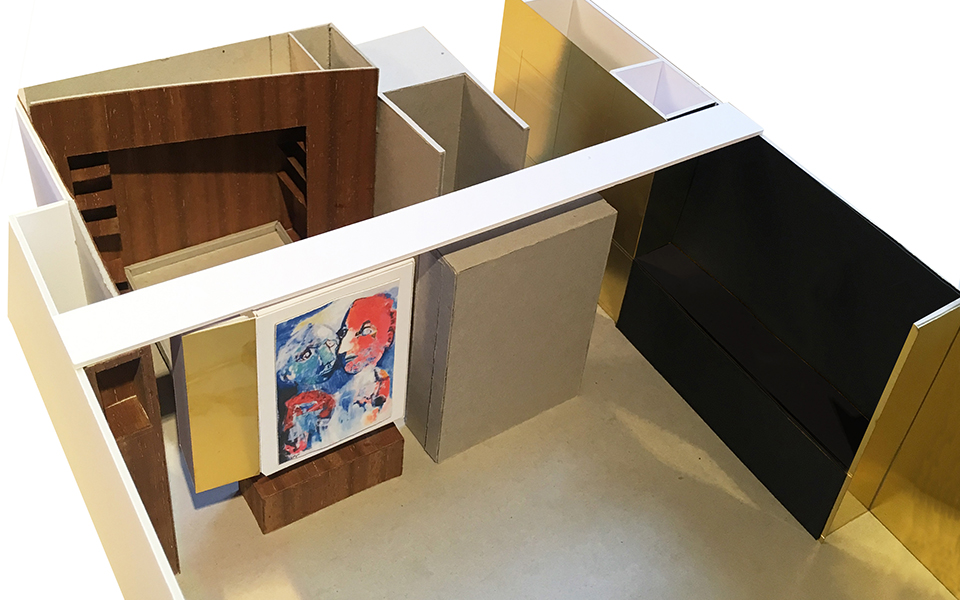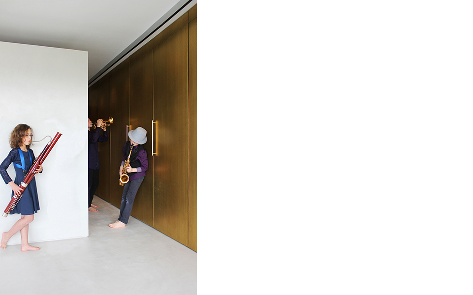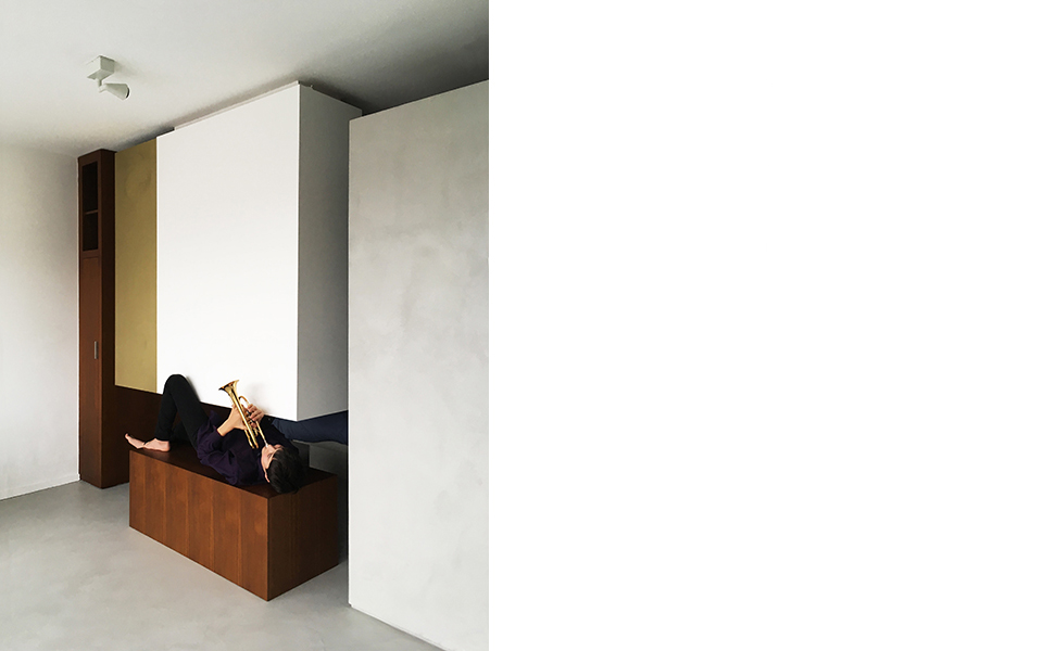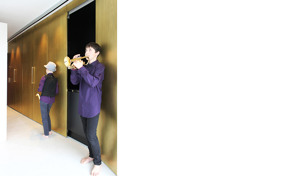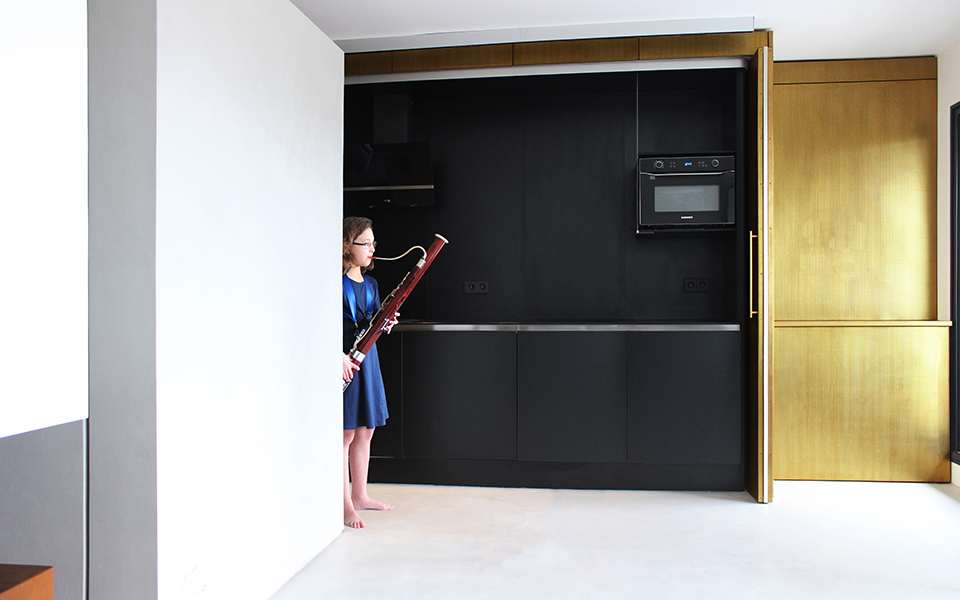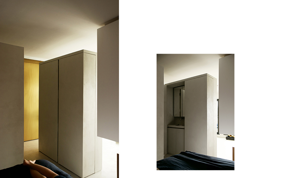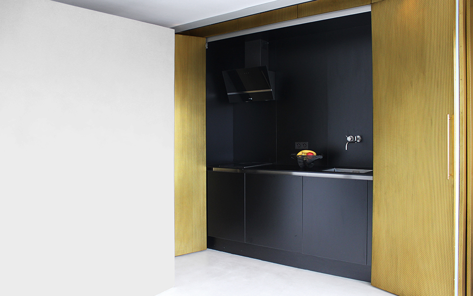 Trois revêtements, de natures distinctes, habillent les boîtes : placage noyer, béton ciré gris et laiton. Matières mates et brillantes, chaudes ou froides, elles confèrent au lieu différentes atmosphères. L’espace nuit est une alcôve, plutôt sombre et chaleureuse, recouverte de noyer avec bibliothèques et dressing intégrés. Le coin salle de bain est en béton ciré. Les portes de la cuisine, ainsi que tous les éléments de rangements depuis l’entrée sont revêtus de laiton perforé qui peuvent être plus ou moins repliés comme un paravent doré qui peut dissimuler tout ou partie les éléments domestiques. Ces panneaux dorés apportent une lumière chaude dans la partie jour de l’appartement. D’autres éléments domestiques peuvent être aussi complétement dissimulés sans pour autant nécessiter une pièce à part qui subdiviserait l’espace et le rendrait plus petit. Le coin vasque/miroir et sèche serviette disparaît par exemple derrière deux grandes portes en béton ciré.