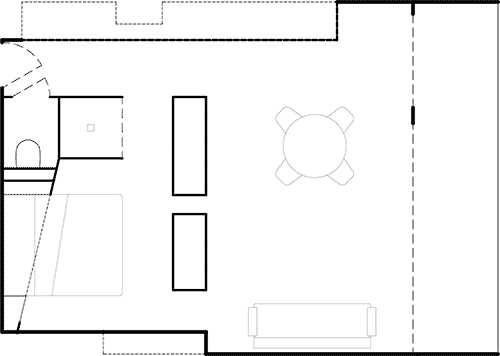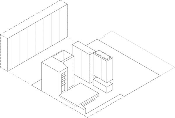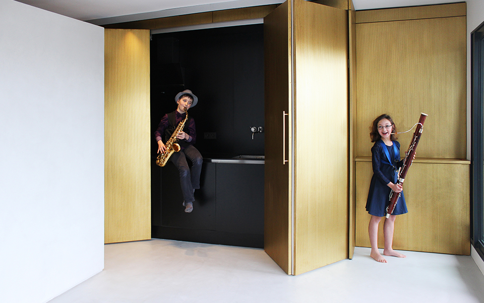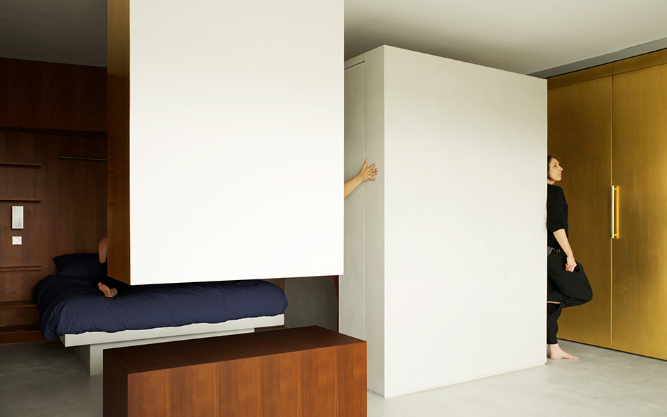 Les parois de ces boîtes se plient et se déplient pour créer différentes configurations d’intimité entre le coin nuit, le séjour et les éléments de salle de bain. Plusieurs systèmes d’ouvertures ont été imaginés : portes pliantes en accordéon sur rails, portes en équerre, portes à galandages.