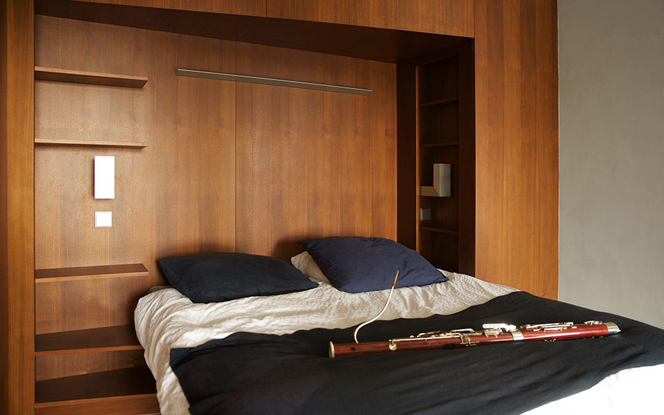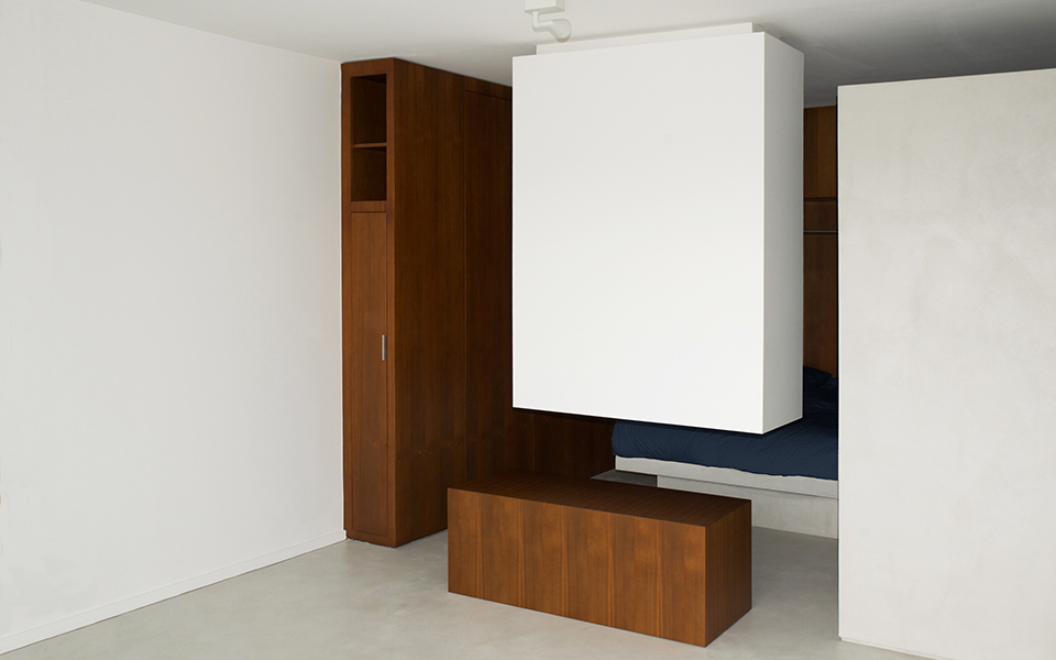 Tout -à l’exception de la table, des chaises et du canapé- a été dessiné et construit sur mesure y compris le lit.