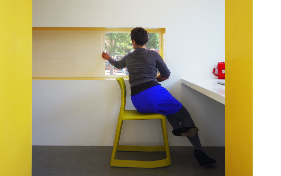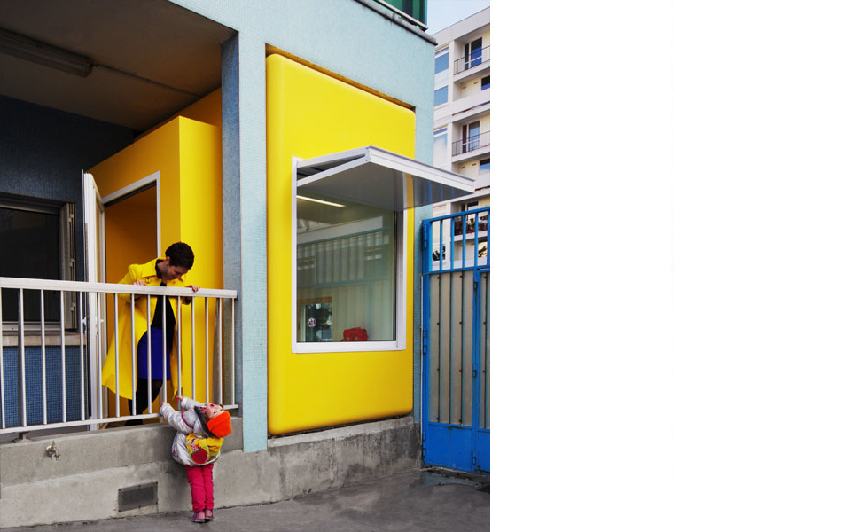 D'abord identifiable par sa couleur vive, cette micro architecture vient poser un point d'ancrage urbain, en termes esthétique et d'accès : l'école se voit marquée d'une véritable séquence d'entrée, à la fois ludique et fonctionnelle.