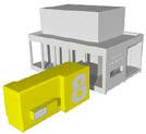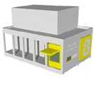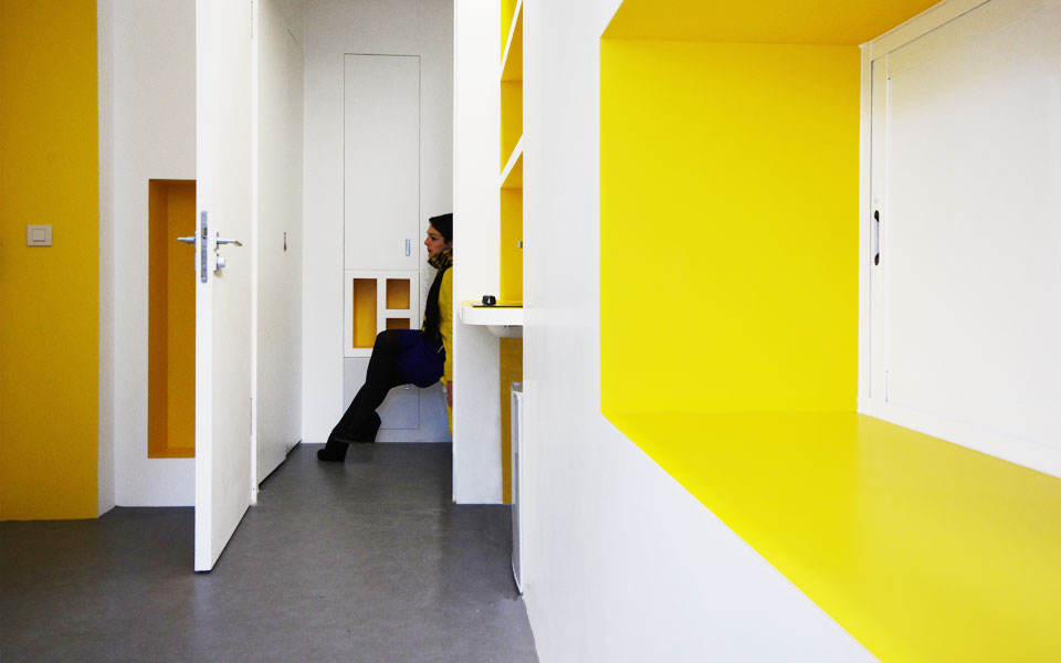 Le module jaune de la nouvelle loge vient s'emboîter dans les ouvertures du bâtiment, à l'image des jeux de construction des enfants.