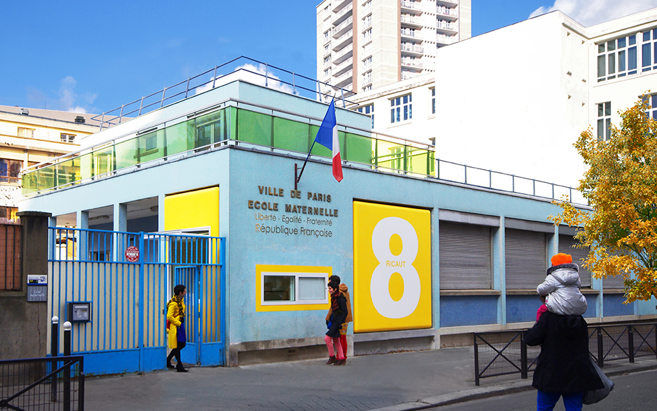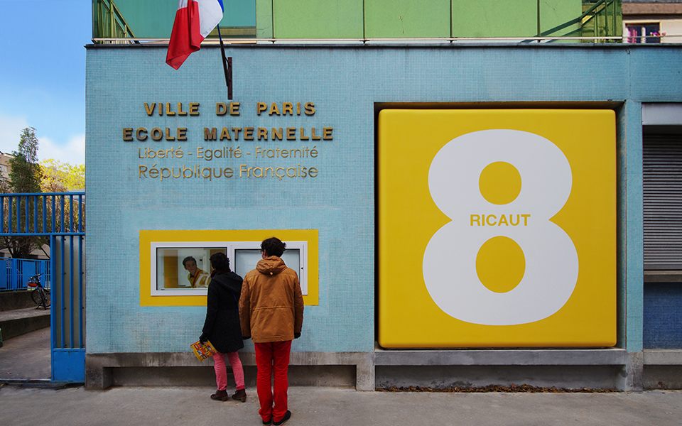 Dans une rue résidentielle, près du quartier animé de la place d'Italie, la nouvelle loge de l'école Ricaut affiche son grand cube jaune, posé en lieu et place de l'ancienne entrée, clarifiant l'accès principal et offrant un espace de travail à la fois visible et indépendant du logement de fonction attenant.
