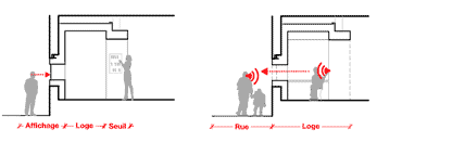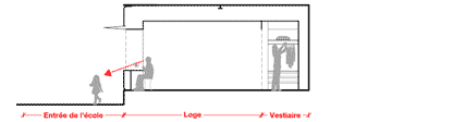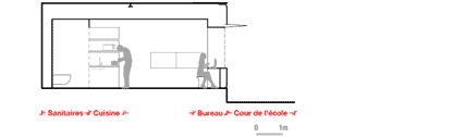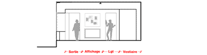 Tous les éléments nécessaires au confort sont aménagés dans les murs pour libérer l'espace central (wc, vestiaire, kitchenenette, tableau d'affichage, placard à clefs, bureau).
