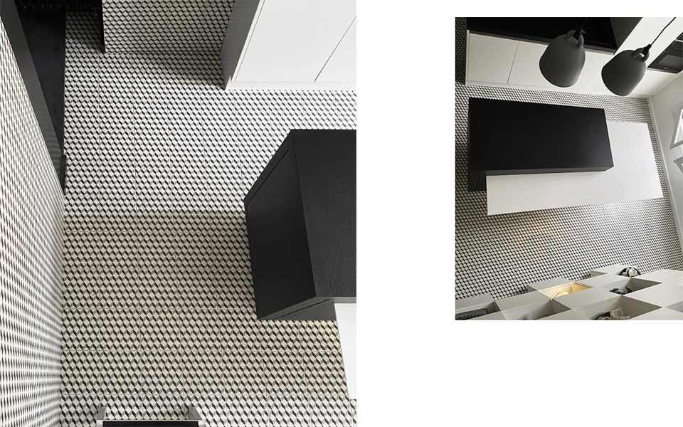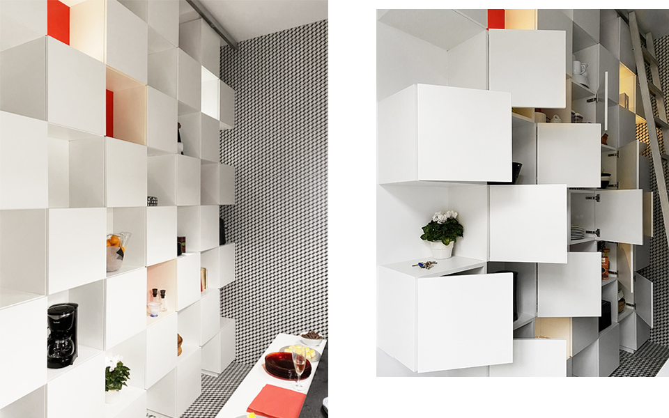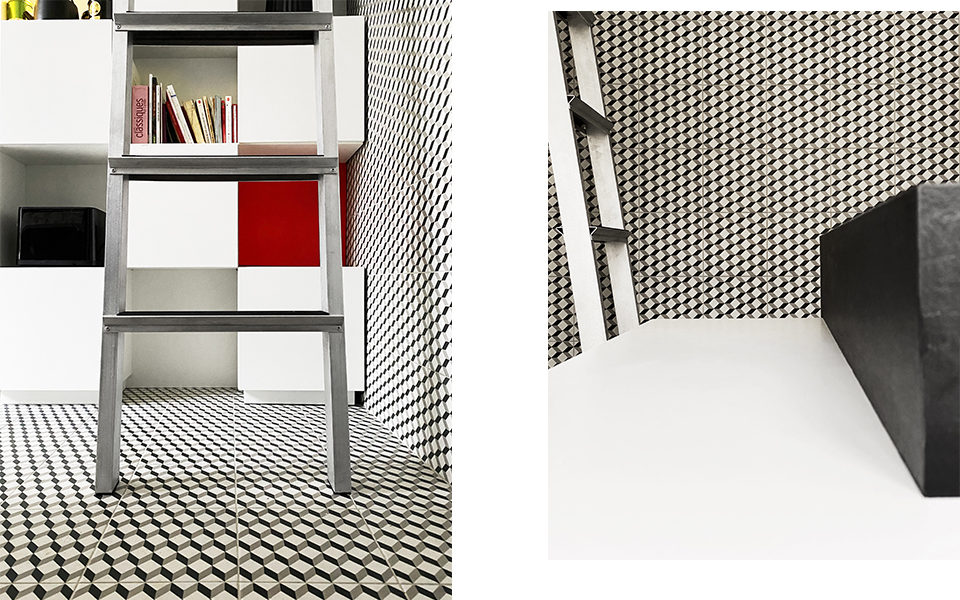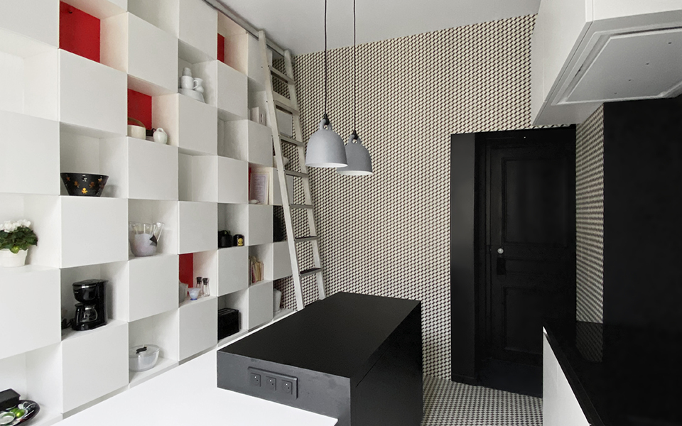 Un stratifié noir texturé ardoise contraste avec des éléments laqués blanc, au sol et sur un mur des carreaux ciments dessinent un motif répondant aux rangements cubiques et aux couleurs dominantes. Enfin le fond rouge de certaines niches et les chaises Navy viennent, par touches, égayer l'espace.