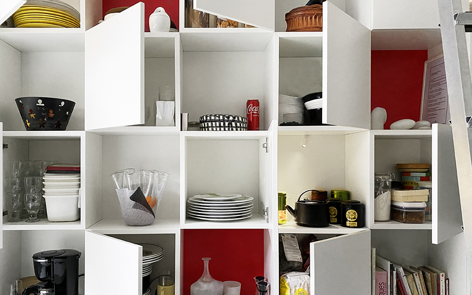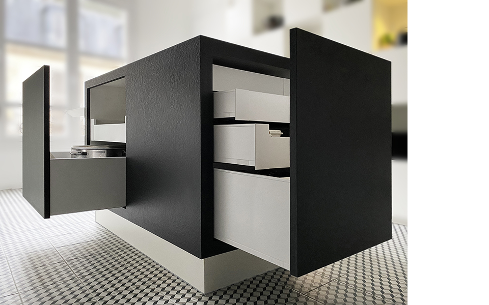 Le dessin d'un îlot central a permis de dégager des circulations efficaces tout en intégrant une table pour 4 à 5 couverts. Autour de cet îlot un mur de cuisine avec plan de travail, et un mur de rangements moins profonds composé d'un damier de cubes.