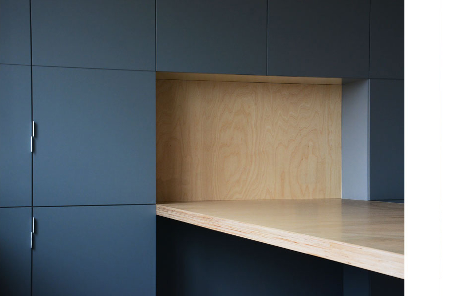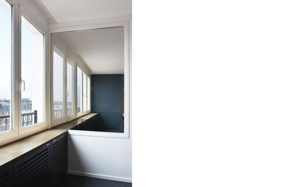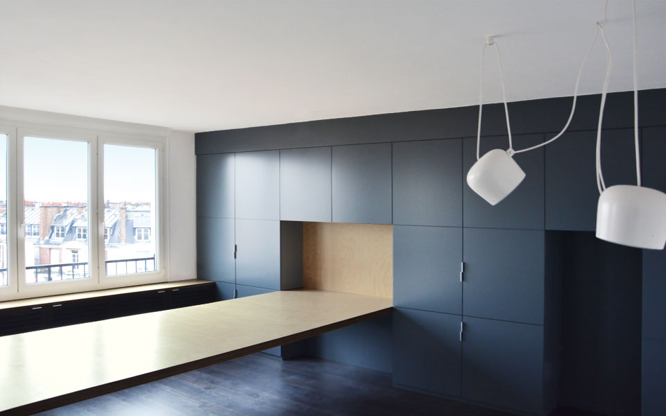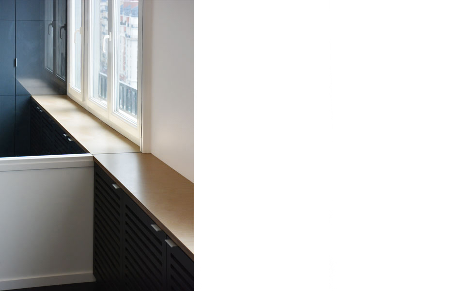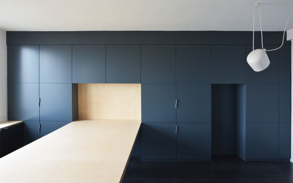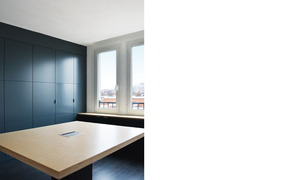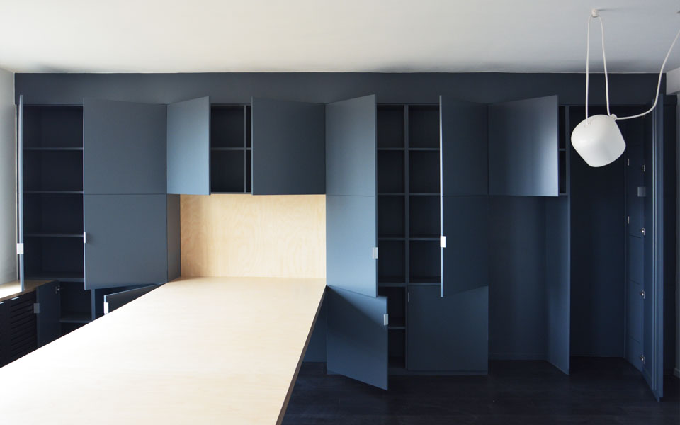 Sous les fenêtres une longue desserte intègre chauffage et rangements. Les murs perpendiculaires aux façades sont utilisés pour le stockage des dossier.