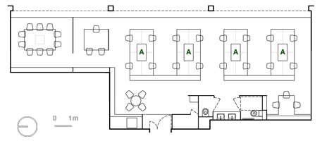 Aucun élément ne semble toucher le sol : les plateaux des tables semblent flotter dans l'espace, la couleur de leur pied central se confondant avec le sol. L'espace est unitaire mais avec des fonctions différenciées : les différents plans colorés structurent l'espace tout en laissant l'intégrité du volume lisible.