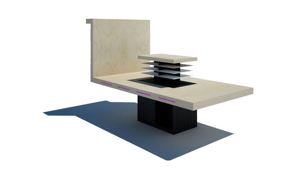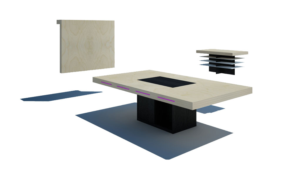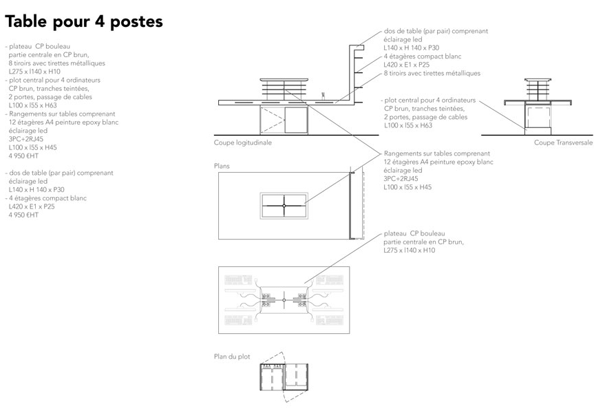 Nous proposons des éléments en bois : parquet chêne grand trafic teinté wengé et des grandes tables en contreplaqué bouleau, dessinées sur mesure.