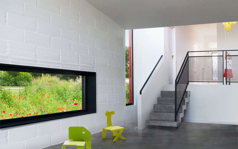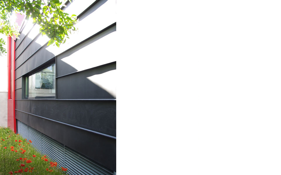 La façade du bâtiment existant est revêtue d'un enduit gris clair tandis que les façades de l'extension sont en zinc anthracite. La partie de l'extension permettant le passage entre le bâtiment existant et l'extension proprement dite, « bow-window » est revêtue d'un bardage aluminium thermolaqué de couleur rouge. Cette transition articule la maison existante et l'extension.