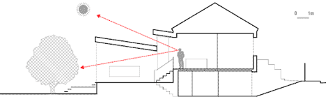 Les aménagements extérieurs notamment les plantations existantes sont inchangées. En effet la luxuriante végétation présente dans le jardin est ce qui motive l'implantation du projet. Seule une terrasse surélevée prolongera l'extension et permettra de rentrer encore un peu plus dans le jardin.