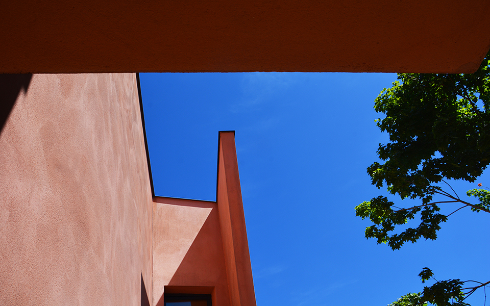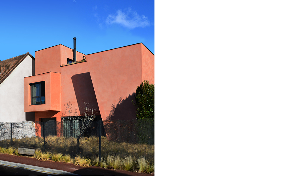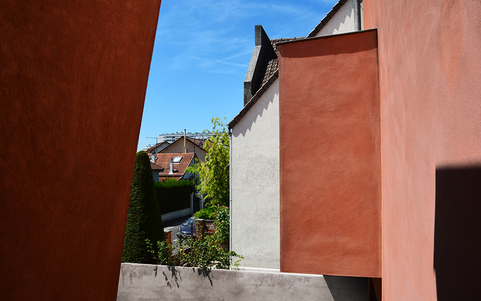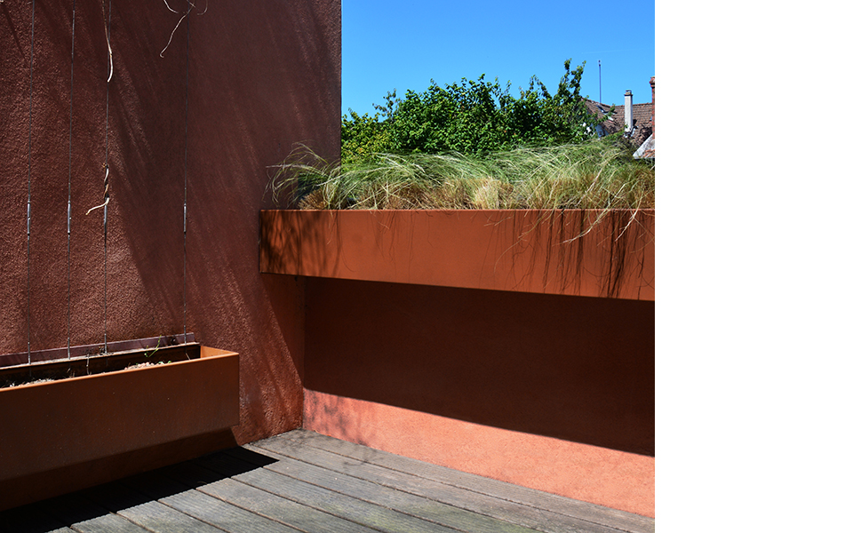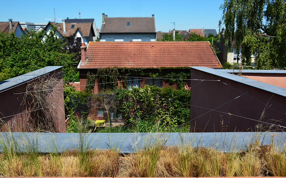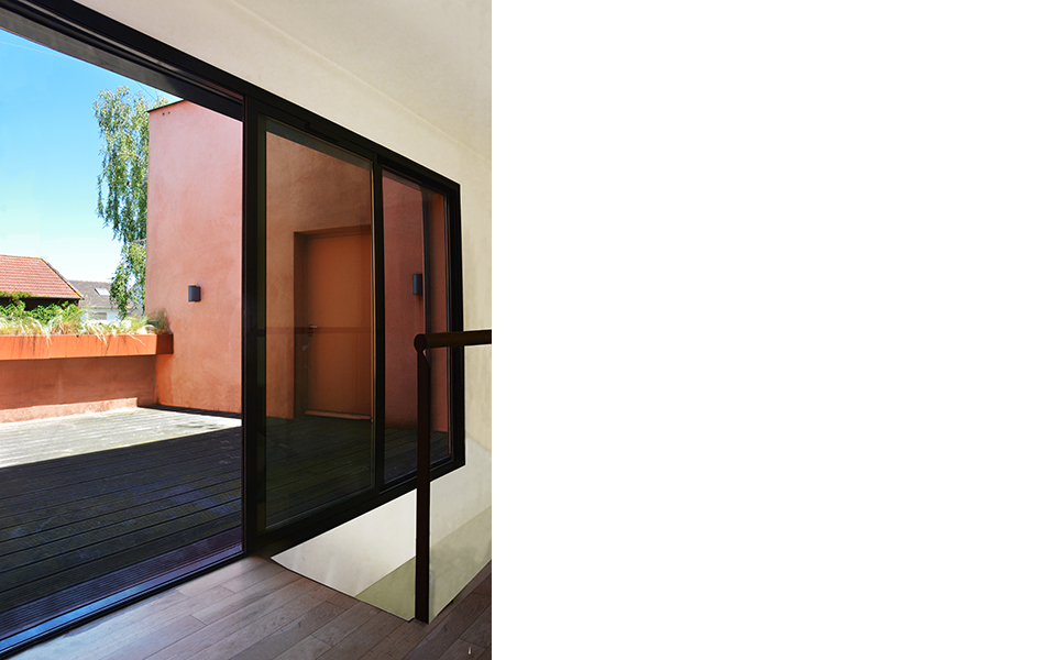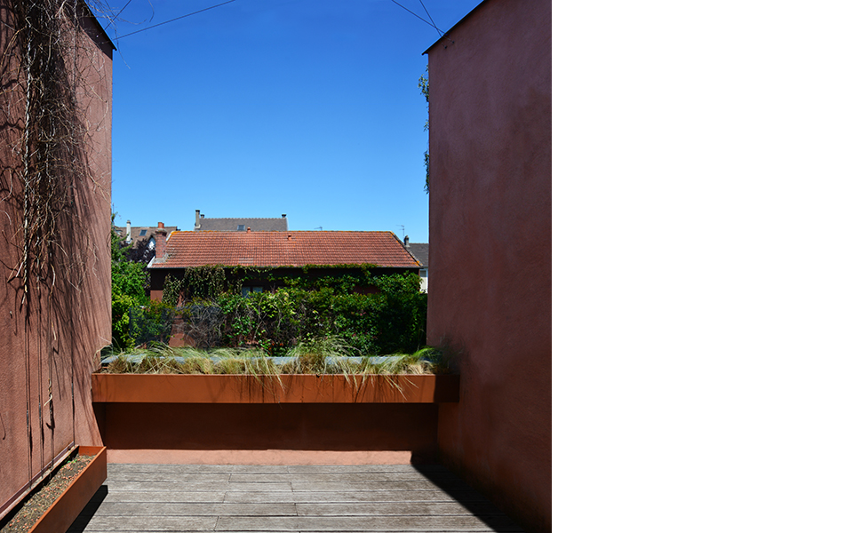 - L’étage (niveau +3,20 m) comporte une salle de bains, la chambre des parents – qui s’ouvre sur une terrasse au-dessus de la cuisine – et la chambre de Clara en bout de passerelle. Le vitrage le long de la passerelle permet d’éclairer naturellement les espaces de circulation et agrémente visuellement le séjour d’un « jardin suspendu ».