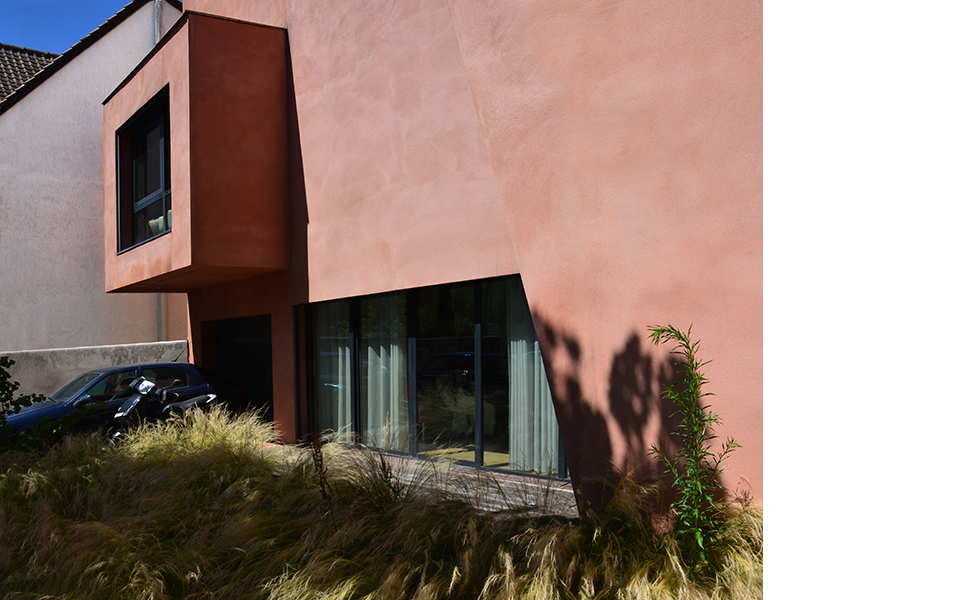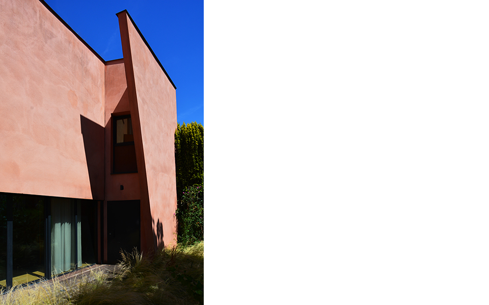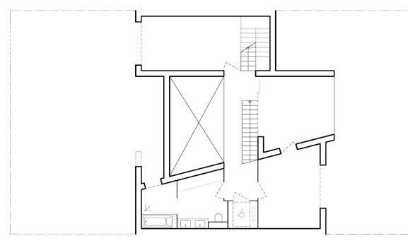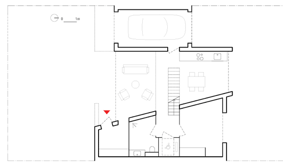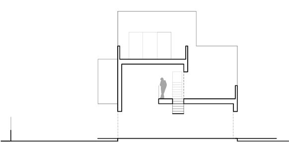 - Le rez-de-chaussée est consacré au garage, à l’entrée sur laquelle donne une salle de bains, au séjour-cuisine traversant et à un bureau. Le volume du séjour est en double hauteur, interrompu par une passerelle en surplomb. L’accès à l’étage se fait soit par l’escalier, soit par l’ascenseur. Deux terrasses nord et sud viennent prolonger l’espace séjour-cuisine sur l’extérieur, proposant ainsi une continuité visuelle.