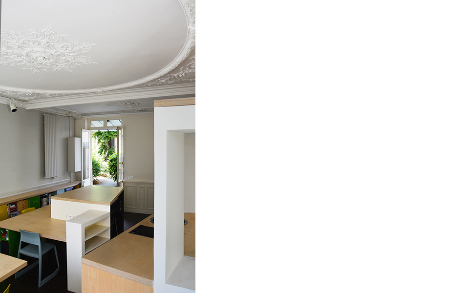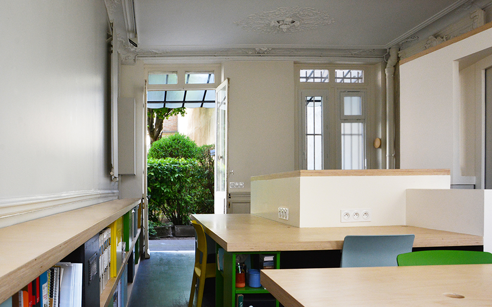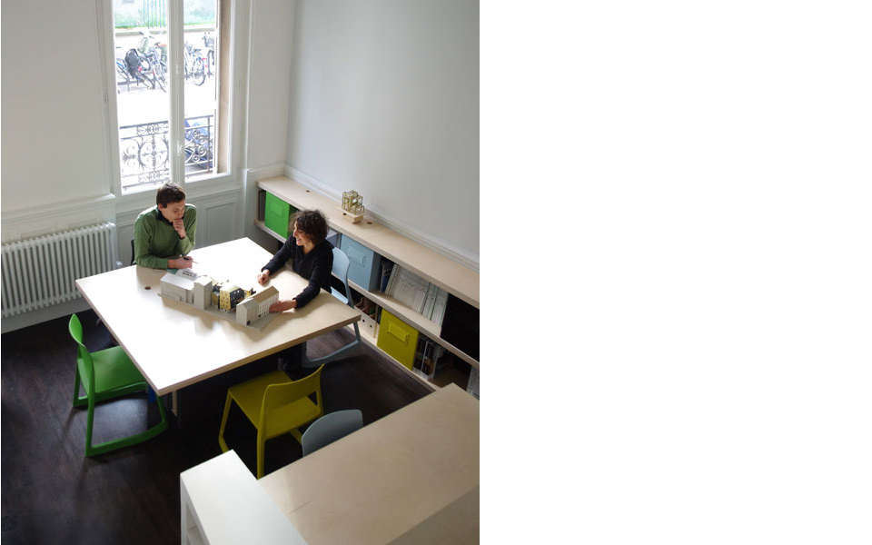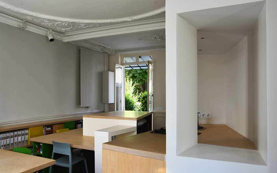 Les pieds de certains murs ont été peints dans la même teinte que le sol formant un stylobate contemporain renforcé par une bibliothèque/desserte sur le mur latéral. Les plateaux de travail, disposés à des hauteurs variés (bureaux, cuisine, toit de la 'boite'...) sont en contreplaqué bouleau. Pour ajouter une touche de gaité, les caissons (récupérés des anciens locaux) ont été repeints dans les mêmes couleurs que les chaises Tip Ton (jaune, bleu, vert et noir).
