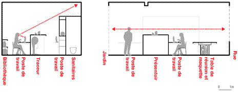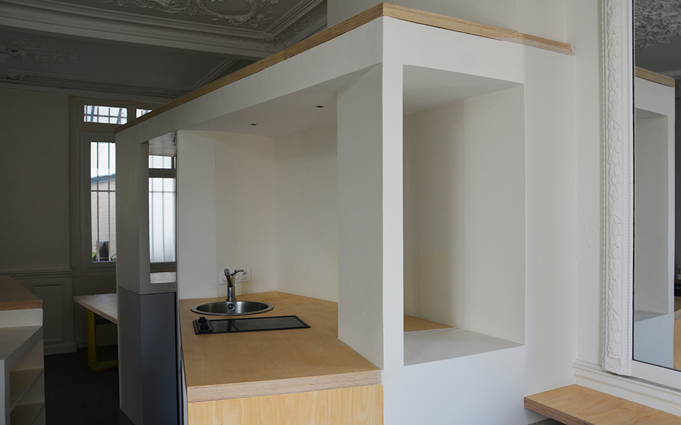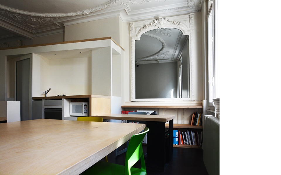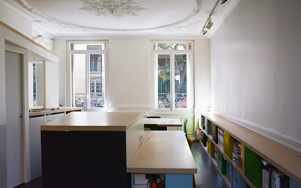Nous n'avons pas résisté à l'envie de remodeler l'espace pour créer un lieu de travail nous correspondant et réaliser ainsi notre premier programme de bureaux. Notre cahier des charges comprenait : 4 postes de travail ayant chacun son intimité, une table à maquette et réunion avec rangements intégrés, une cuisine, des sanitaires, une bibliothèque, un espace pour le matériel informatique (traceur...), un mur d'affichage, et un présentoir à maquettes.