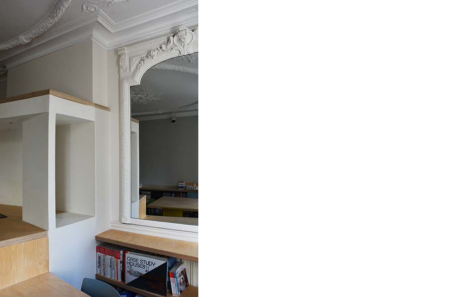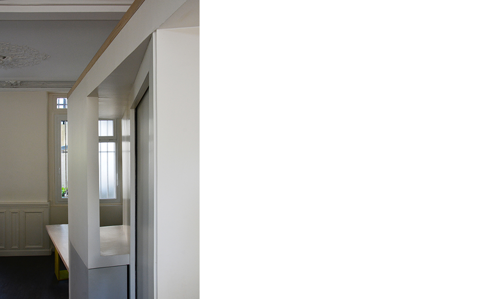Le lieu était divisé par une cloison que nous avons déposée pour dégager le beau volume traversant du local. Pour conserver ce sentiment d'espace et ces vues nous avons travaillé les sanitaires et la cuisine comme une boite ludique percée, creusée et détachée du plafond. Les postes dispersés en plan, se tournent tous vers le centre. Un îlot (présentoir à maquette abritant le traceur) est placé au centre à hauteur d'œil pour une personne assise. Celui-ci délimite des zones et offre intimité aux postes de travail tout en laissant le volume intact en position debout.