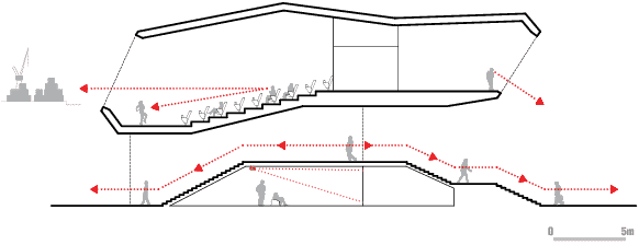 Circulations et matière reprennent l'écriture portuaire/industrielle du site et des architectures en béton de O. Niemeyer et A. Perret.