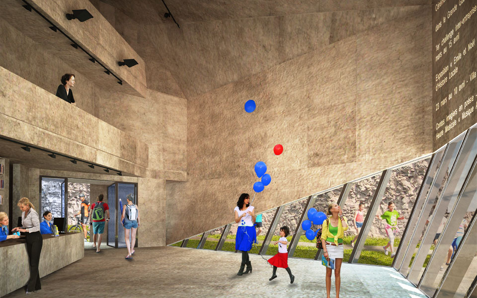 Lorsque le visiteur entre dans la ville, il perçoit une masse qui se dresse formant un signal, en écho à la tour des anciens remparts qui s’ouvre devant elle. L’enveloppe brute et minérale de cette forme abstraite se soulève et semble léviter au-dessus d’une paroi de verre inclinée : une vitrine sur l’espace d’accueil.
