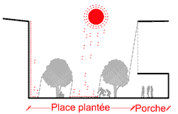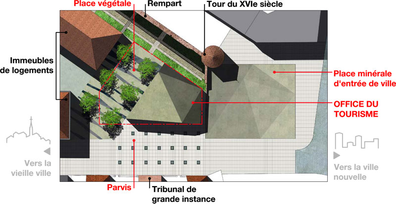 3- une place végétale met en scène la façade Ouest d’entrée de l’office du tourisme et se greffe aux autres places de la ville.