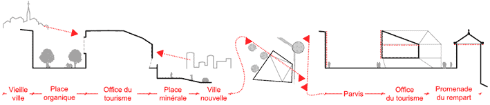 4- la promenade le long du rempart est prolongée afin que celui-ci entre visuellement par la façade Nord du projet de l’office de tourisme.