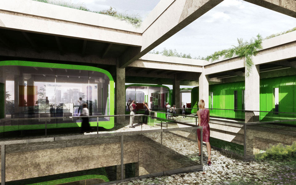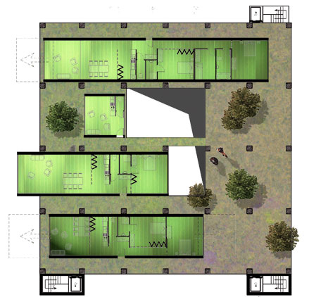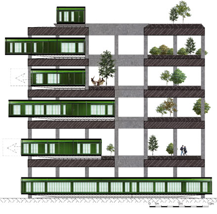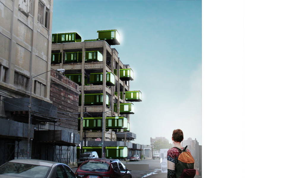 A Williamsburg et Greenpoint, quartiers de Brooklyn au passé industriel, des anciennes manufactures en structure béton sont aujourd'hui transformées en logements et ateliers d'artistes. Nous proposons une alternative à la réhabilitation consistant à mettre des fenêtres dans les ouvertures existantes. La structure en béton est considérée comme le « casier à bouteilles » de Le Corbusier ou la nappe de Yona Friedman dans laquelle viennent se glisser des cellules préfabriquées et de la végétation qui peut s'installer facilement compte tenu de la surcharge admissible importante et de la hauteur sous-plafond conséquente.