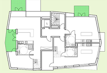 Les grands logements sont triplement orientés avec des accès terrasses ou jardins privatifs. Les logements en rez-de-chaussée bénéficient tous d’un accès patios ou jardin, les logements du R+1 donnent également sur un jardin avec une épaisseur de terre végétale de 80cm. Les logements en R+2 ont une grande terrasse tandis que les logements du R+3 & combles sont tous en duplex et profitent d’un balcon au R+3 et d’une terrasse au dernier niveau.