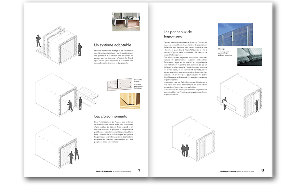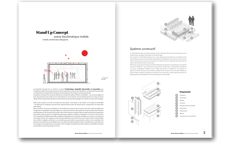 Le Stand-Up Concept est un système constructif bioclimatique adaptable démontable et remontable pour l’installation rapide d’une salle pouvant accueillir spectacles, évènements et répétitions. Le Stand-Up Concept offre une alternative aux chapiteaux et tentes avec des exigences thermique et acoustique élevées.