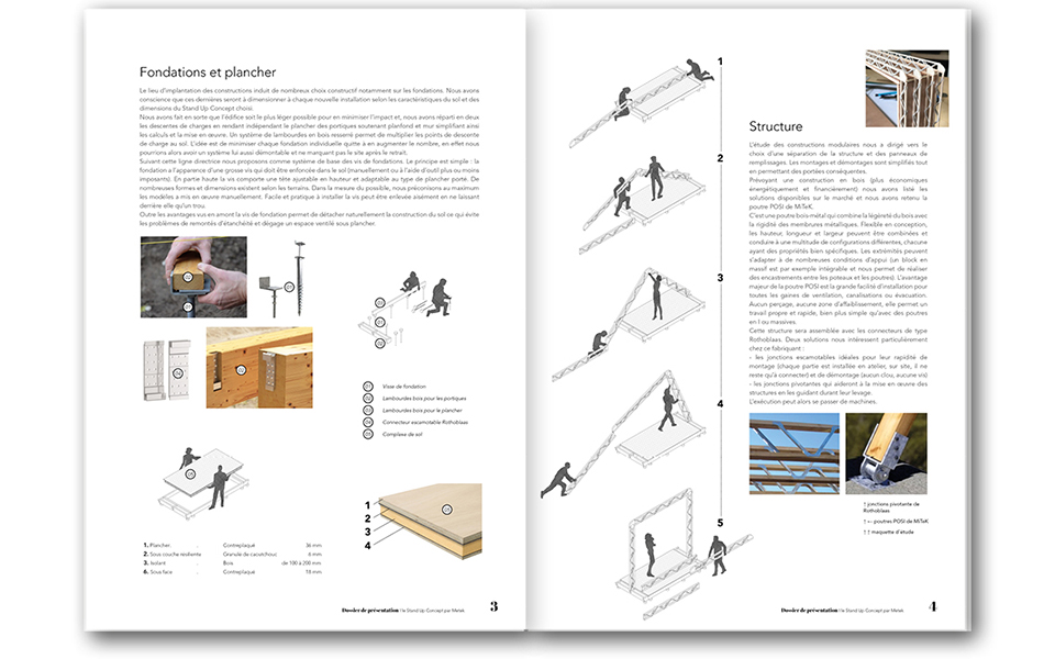 Nous travaillons à une éco-conception sur l’ensemble du processus. Au commencement des matériaux faiblement énergivores et recyclables (nous privilégions au maximum le bois) et des systèmes aux plus proches des éléments standards pour éviter les pertes de temps et de matière liées par exemple à des recoupes particulières engendrant des chutes). Nous favorisons l’usinage des pièces pour gagner en délais et s’épargner un maximum de travail sur site nécessitant les déplacements des outillages et des personnes. En phase montage nous voulons une exécution sans engins. Durant son usage la construction sera faiblement consommatrice tout en étant sobre en technologies (une isolation adaptée combinée à une double peau permettant une protection solaire et une ventilation de qualité). La maintenance est simplifiée avec un accès le plus direct possible à chacun des éléments constitutifs pour leur entretien et remplacement si nécessaire. En fin d’usage l’ensemble sera démontable et réutilisable en laissant la plus faible empreinte possible sur le site.