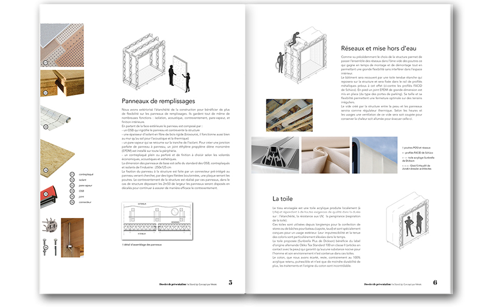 Le système constructif se compose d’éléments manutentionnables à fixations réversibles : une structure légère en bois, des panneaux bois isolés et une toile étanche en recouvrement. Cet ensemble permet une mise en œuvre rapide et économique dans des sites contraints d’accès sans sacrifier le design et en offrant un haut confort d’usage.